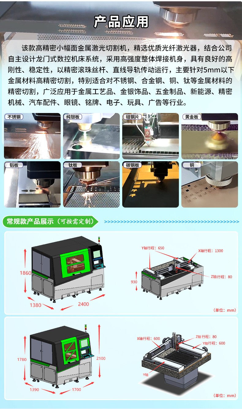 該款高精密小幅面金屬激光切割機(jī),精選優(yōu)質(zhì)光纖激光器,結(jié)合公司自主設(shè)計(jì)龍門式數(shù)控機(jī)床系統(tǒng),采用高強(qiáng)度整體焊接機(jī)身,具有良好的高剛性、穩(wěn)定性,以精密滾珠絲桿、直線導(dǎo)軌傳動(dòng)運(yùn)行,主要針對5mm以下金屬材料高精密切割,具有精度高、速度快、轉(zhuǎn)化率高、免維護(hù)、運(yùn)轉(zhuǎn)成本低、體積小等一系列優(yōu)點(diǎn),特別適合對不銹鋼、合金鋼、銅、鈦等金屬材料的精密切割,廣泛應(yīng)用于金屬工藝品、金銀飾品、五金制品、新能源、精密機(jī)械、汽車配件、眼鏡、銘牌、電子、玩具、廣告等行業(yè)。